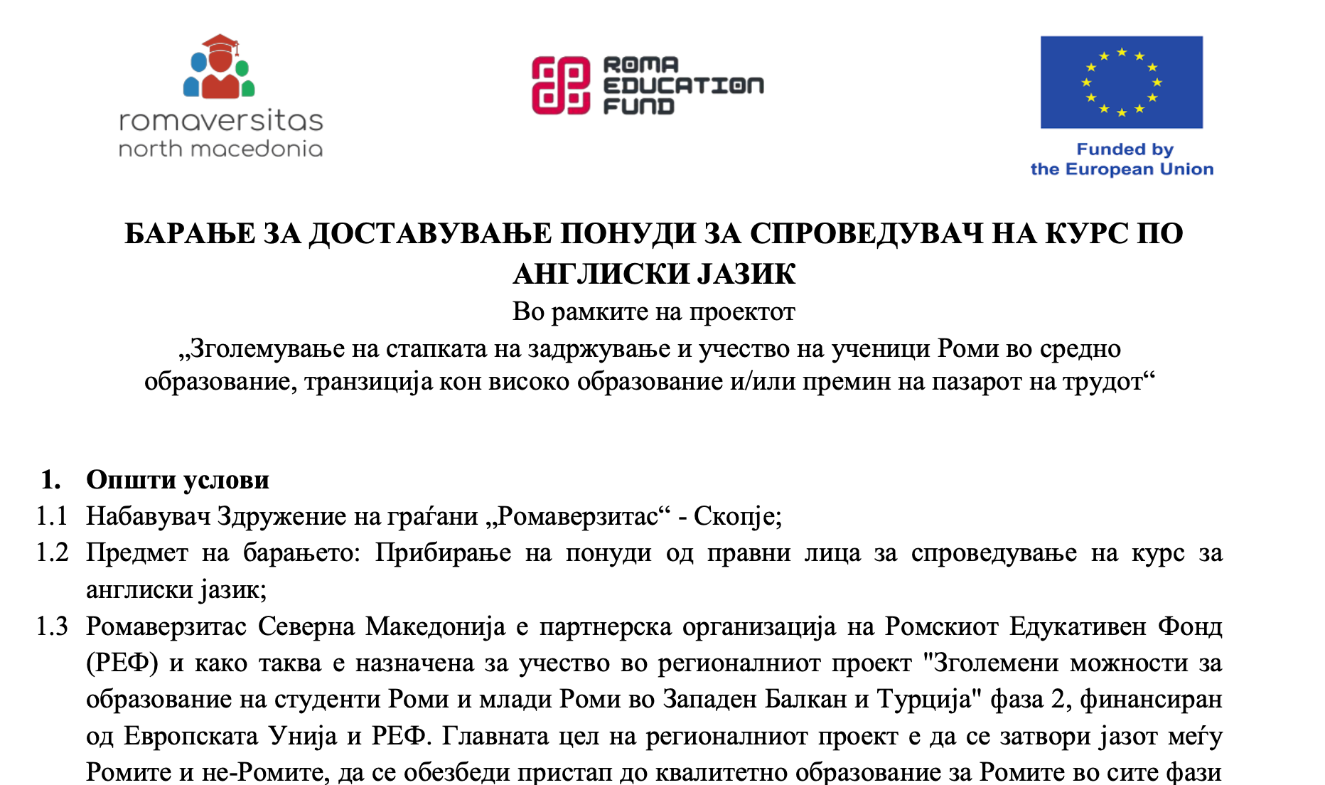 БАРАЊЕ ЗА ДОСТАВУВАЊЕ ПОНУДИ ЗА СПРОВЕДУВАЧ НА КУРС ПО АНГЛИСКИ ЈАЗИК Во рамките на проектот „Зголемување на стапката на задржување и учество на ученици Роми во средно образование, транзиција кон високо образование и/или премин на пазарот на трудот“.