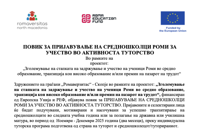 Здружението на граѓани „Ромаверзитас“ - Скопје во рамките на проектот: „Зголемување на стапката на задржување и учество на ученици Роми во средно образование, транзиција кон високо образование и/или премин на пазарот на трудот“, финансиран од Европска Унија и РЕФ, објавува повик за ПРИЈАВУВАЊЕ НА СРЕДНОШКОЛЦИ РОМИ ЗА УЧЕСТВО ВО АКТИВНОСТА ТУТОРСТВО. Пријавените и селектирани лица ќе бидат подучувани, мотивирани и насочувани за успешно транзитирање на средношколците во следната учебна година или за полагање на државна или училишна матура, во период од Ноември - Декември 2025 година (два месеци), преку индивидуална туторска програма подготвена од страна на туторот и средношколецот/туторираниот.