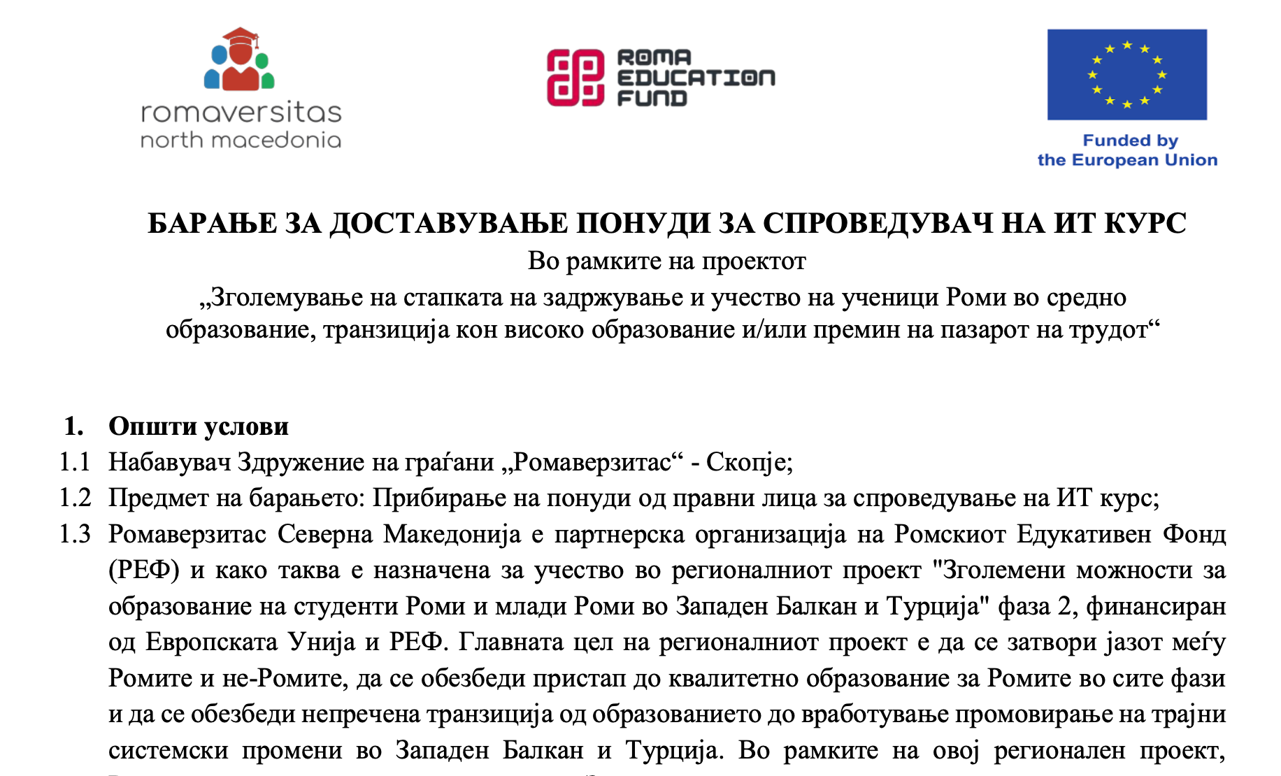 БАРАЊЕ ЗА ДОСТАВУВАЊЕ ПОНУДИ ЗА СПРОВЕДУВАЧ НА ИТ КУРС (за средно)