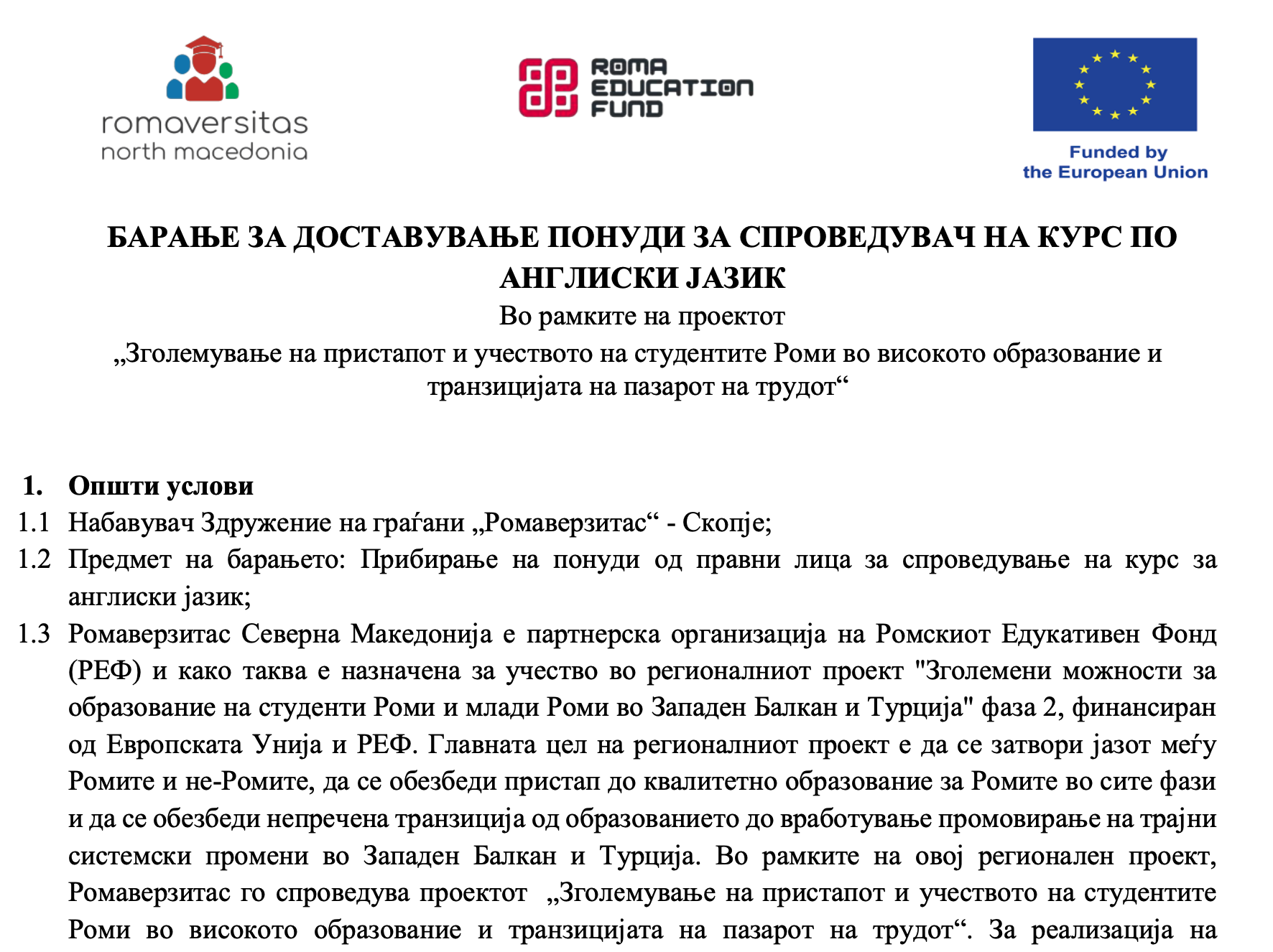БАРАЊЕ ЗА ДОСТАВУВАЊЕ ПОНУДИ ЗА СПРОВЕДУВАЧ НА КУРС ПО АНГЛИСКИ ЈАЗИК