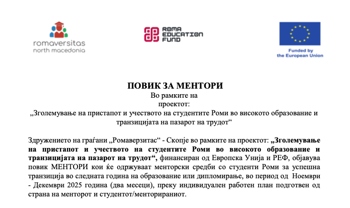 Здружението на граѓани „Ромаверзитас“ - Скопје во рамките на проектот: „Зголемување на пристапот и учеството на студентите Роми во високото образование и транзицијата на пазарот на трудот“, финансиран од Европска Унија и РЕФ, објавува повик МЕНТОРИ кои ќе одржуваат менторски средби со студенти Роми за успешна транзиција во следната година на образование или дипломирање, во период од Ноември - Декември 2025 година (два месеци), преку индивидуален работен план подготвен од страна на менторот и студентот/менторираниот.
