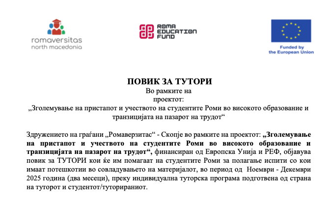Здружението на граѓани „Ромаверзитас“ - Скопје во рамките на проектот: „Зголемување на пристапот и учеството на студентите Роми во високото образование и транзицијата на пазарот на трудот“, финансиран од Европска Унија и РЕФ, објавува повик за ТУТОРИ кои ќе им помагаат на студентите Роми за полагање испити со кои имаат потешкотии во совладувањето на материјалот, во период од Ноември - Декември 2025 година (два месеци), преку индивидуална туторска програма подготвена од страна на туторот и студентот/туторираниот.