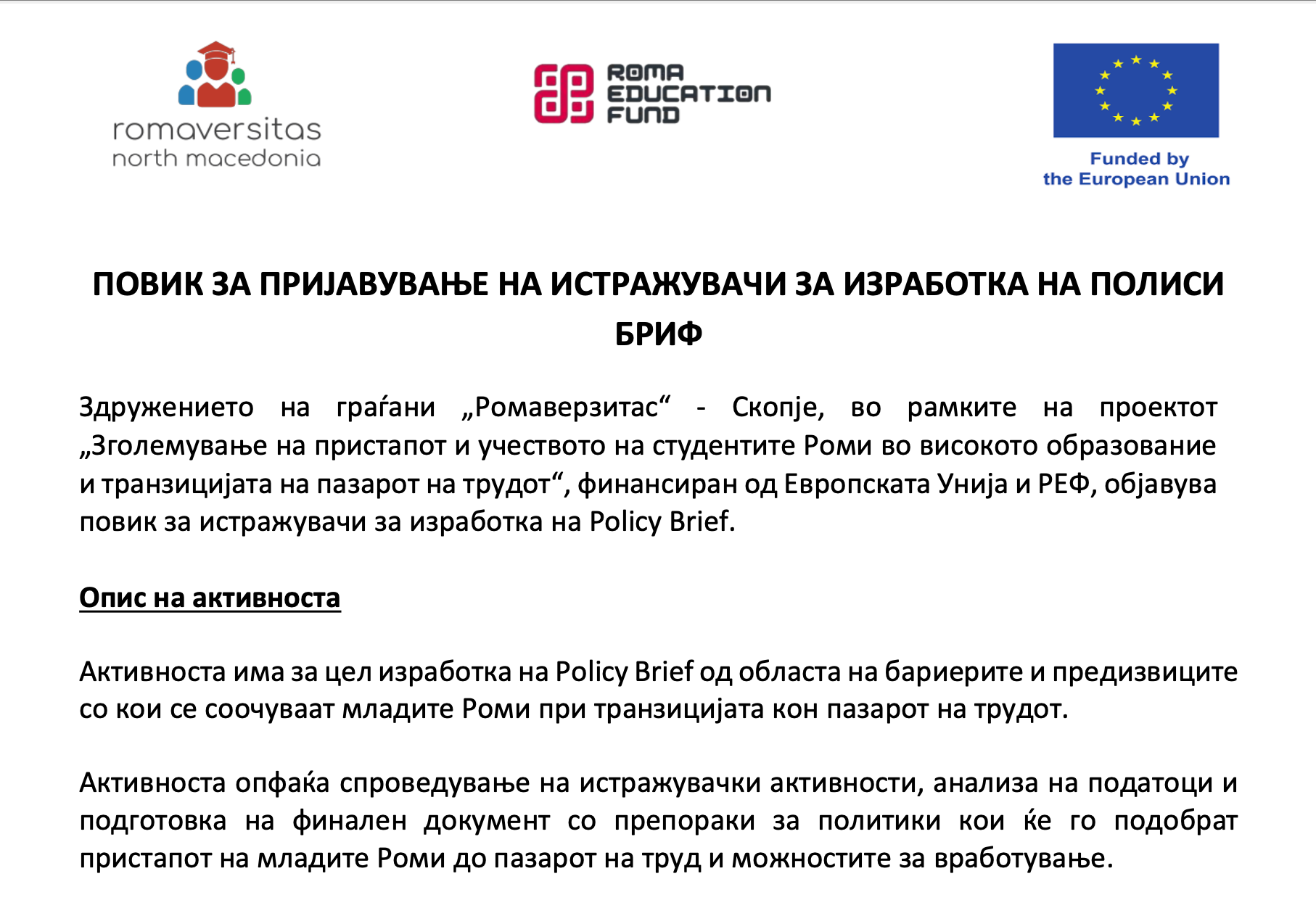 Здружението на граѓани „Ромаверзитас“ - Скопје, во рамките на проектот „Зголемување на пристапот и учеството на студентите Роми во високото образование и транзицијата на пазарот на трудот“, финансиран од Европската Унија и РЕФ, објавува повик за истражувачи за изработка на Policy Brief.
